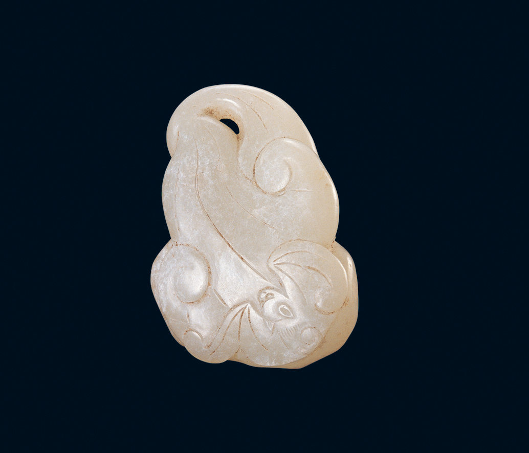 • 白色, 玉质温润, 微透光。整体形状似一朵祥云上飞舞着一只蝙蝠;云尾为佩首, 钻半圆形孔眼。整体形态动静结合, 画面简洁, 线条流畅, 形态生动, 栩栩如生。